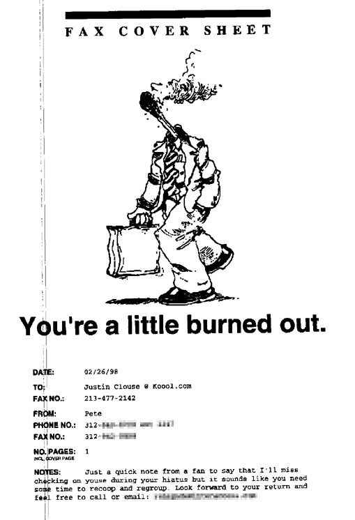 | Date: Fri, 27 Feb 1998 22:48:58 -0600 Subject: :-) Justin, I've never written to you, but I've read a good 80% or so of your "Life" entries. I just want to offer you my thanks and support. You have helped me to understand myself (not to mention you are a pretty entertaining writer too:-). I missed the entries you deleted, so I really don't know exactly what has happened or what kind of criticism you got. All I can say is I appreciate your writings. And I can certainly understand if you decide to take a break or even stop. You are so honest and brave. If there is anything I could do to help you......talk, email, whatever.....I am here for you. Call me anytime (###)###-####, if you like. I know this is really strange because I really don't know you and you for sure don't know me (however, I'm a pretty good guy:-), but I care for you and I am concerned for you. I will refrain from saying something like "hang in there guy", but I hope you know where I am coming from. I hope you have a great spring break!!!